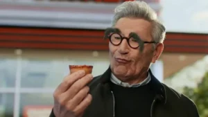 It’s amusing because his eyebrows don’t just pop off; they keep appearing in unexpected places. They land on other people’s faces, stick to random objects, and pop up in scenes where they clearly don’t belong. The over-the-top journey of the eyebrows, paired with Levy acting like nothing’s strange, makes the whole ad absurd and highly amusing.